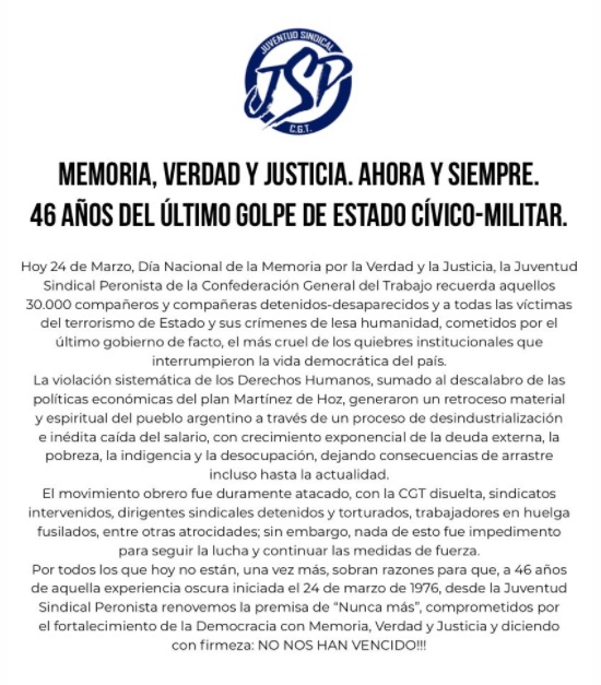 La Juventud Sindical Peronista de la CGT, liderada por Sebastián Maturano moviliza en la jornada de hoy a las puertas del Congreso de la Nación en conmemoración del 24 de Marzo al cumplirse 46 años del golpe de estado cívico-militar que tiñó de sangre la historia de la Argentina.