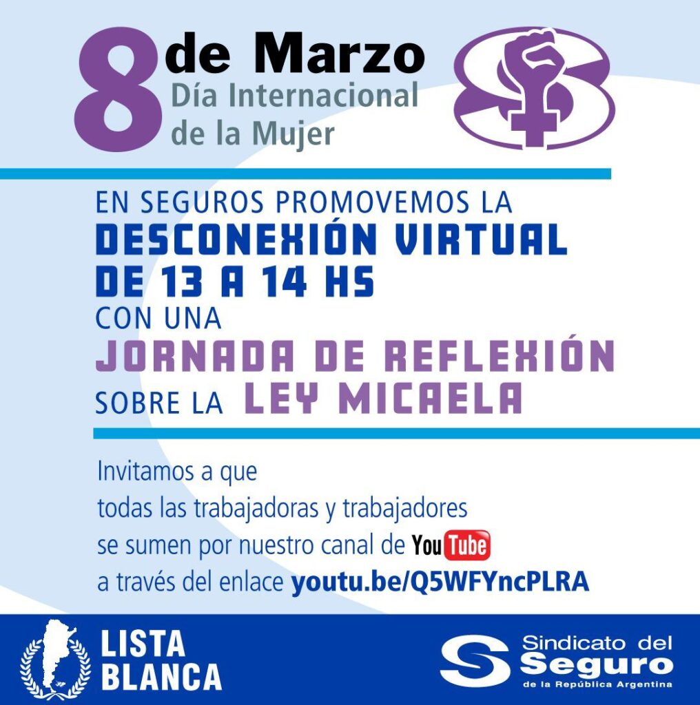 El próximo 8 de marzo se conmemora el Día Internacional de la Mujer, y el Sindicato del Seguro ofrecerá una jornada de desconexión virtual, con la intención de profundizar la reflexión sobre la ley Micaela.