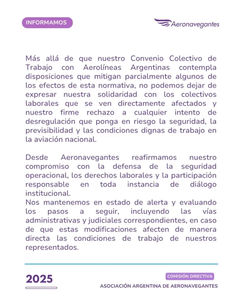 En este marco, desde la organización gremial explicaron que “más allá de que nuestro Convenio Colectivo de Trabajo con Aerolíneas Argentinas contempla disposiciones que mitigan parcialmente algunos de los efectos de esta normativa, no podemos dejar de expresar nuestra solidaridad con los colectivos laborales que se ven directamente afectados y nuestro firme rechazo a cualquier intento de desregulación que ponga en riesgo la seguridad, la previsibilidad y las condiciones dignas de trabajo en la aviación nacional”.