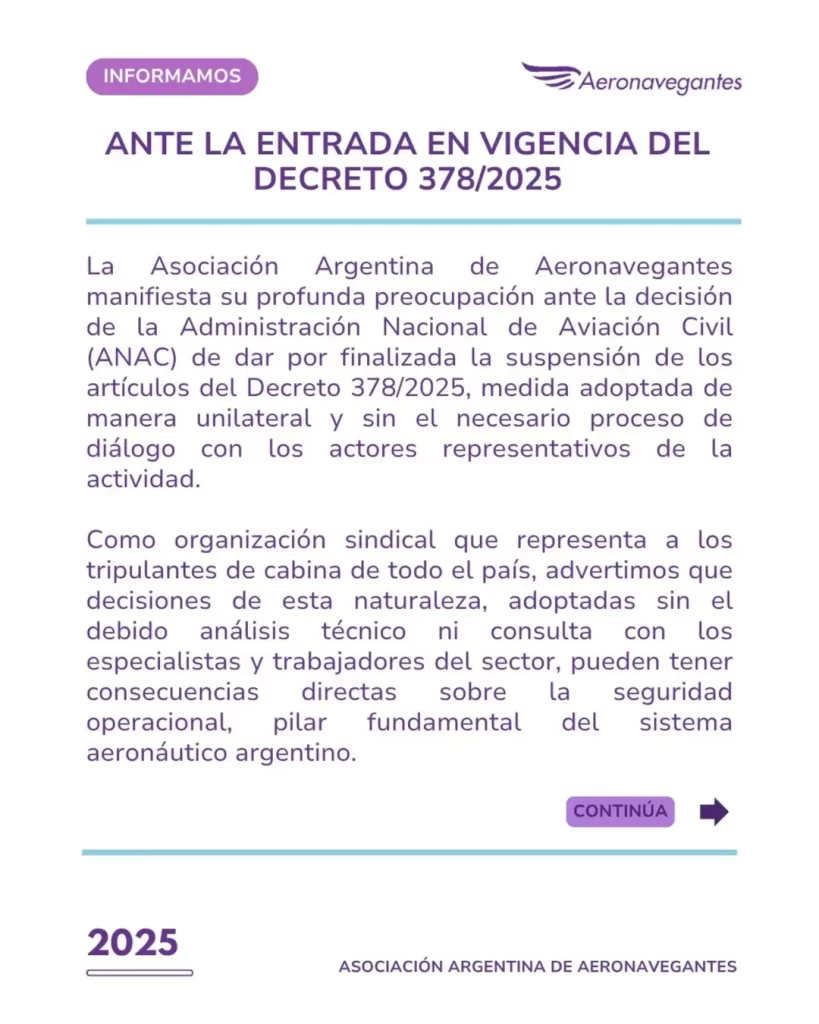 Ante la decisión de la Administración Nacional de Aviación Civil (ANAC) de dar por finalizada la suspensión de los artículos del Decreto 378/2025, medida adoptada de manera unilateral y sin el necesario proceso de diálogo con los actores representativos de la actividad, la Asociación Argentina de Aeronavegantes salió a manifestar su profunda preocupación frente a las consecuencias en la seguridad aerocomercial que esta medida pueda ocasionar.