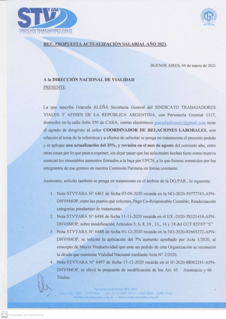 Graciela Aleña, secretaria general del Sindicato Trabajadores Viales y Afines de la Rep. Arg., emitió una carta dirigida al señor Coordinador de Relaciones Laborales, exigiendo la modificación de la paritaria del sector que se vio altamente perjudicada en las negociaciones por la firma de UPCN.