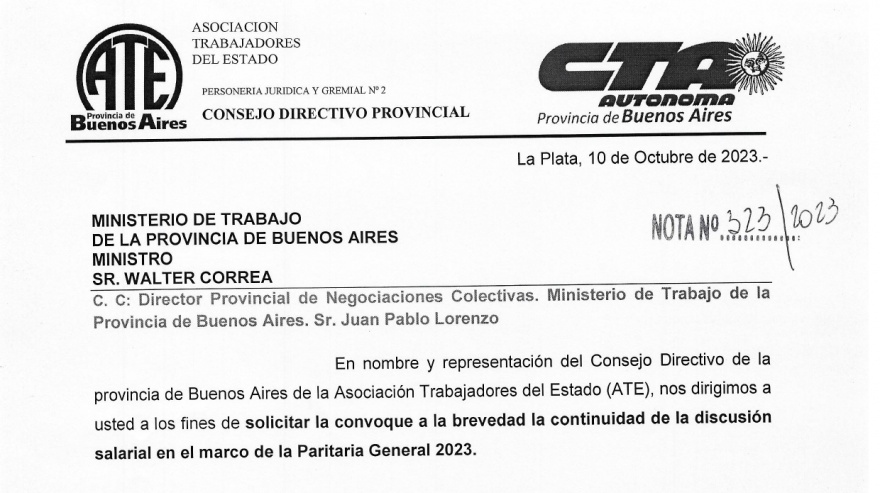 La Asociación de Trabajadores del Estado en su versión provincia de Buenos Aires, le envió una nota al gobernador Axel Kicillof para solicitarle la reapertura paritaria. La misiva fue también direccionada al ministro de Trabajo, Walter Correa.