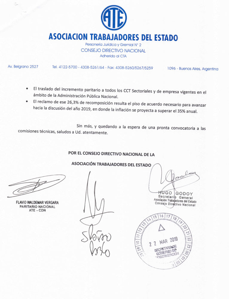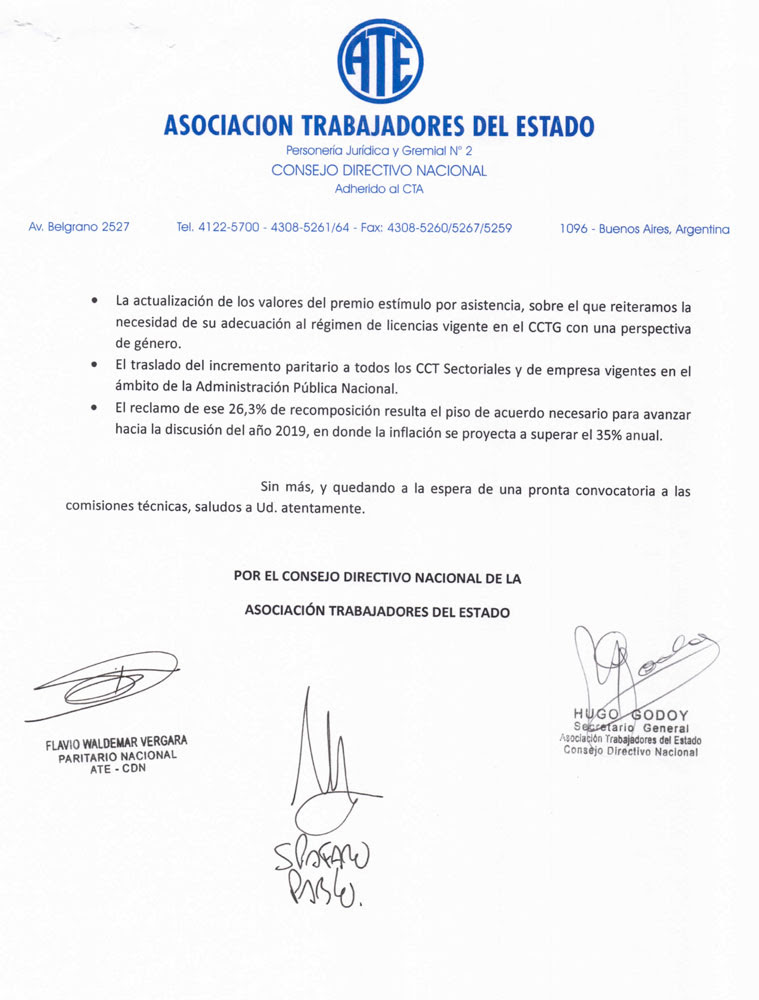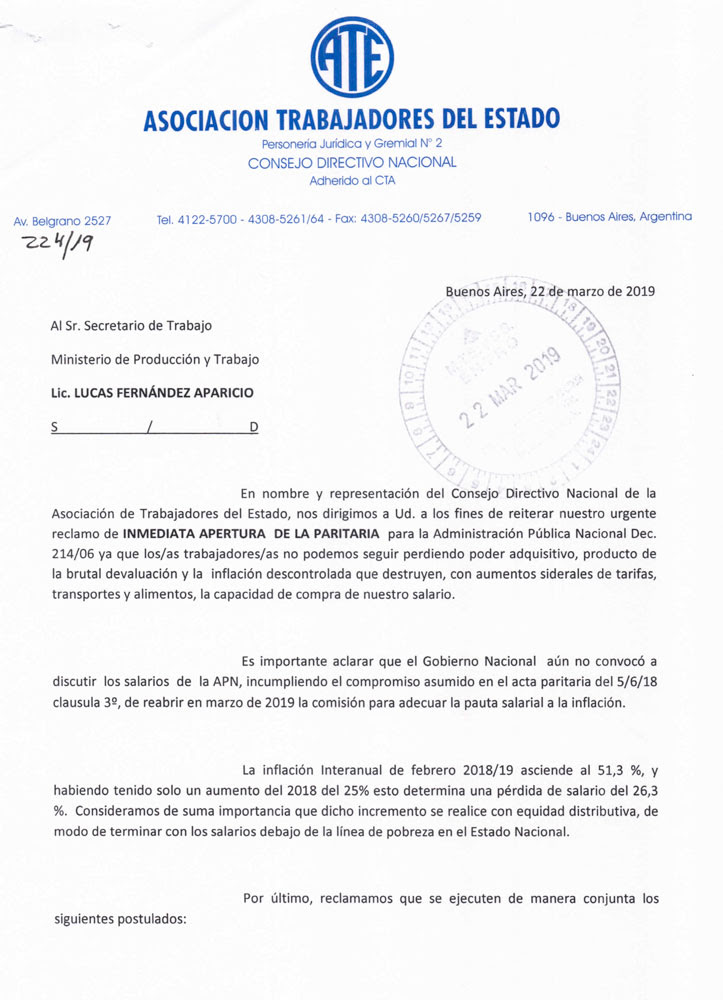 Desde ATE informaron que “El Gobierno Nacional no convocó a discutir los salarios de la APN, incumpliendo el compromiso asumido en el Acta paritaria del 5/6/18 clausula tercera, de reabrir en marzo de 2019 la comisión para adecuar la pauta salarial a la Inflación”.