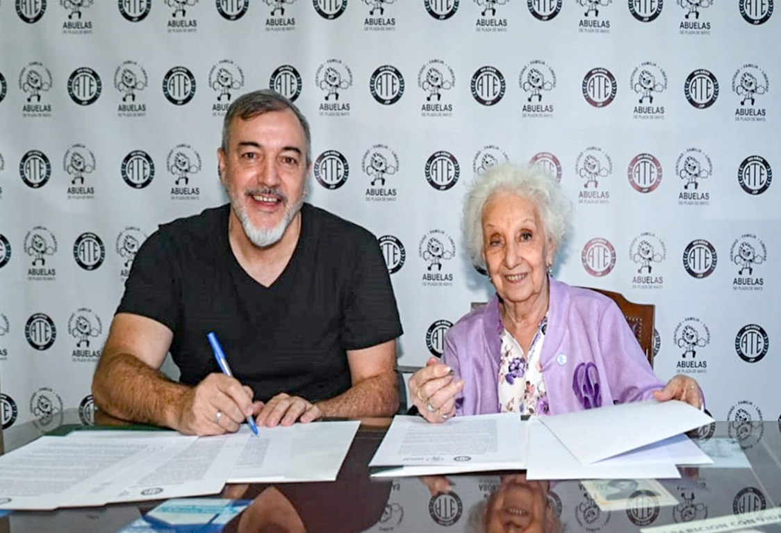 En una histórica ceremonia para la Asociación Trabajadores del Estado (ATE), el Secretario General del sindicato, Rodolfo Aguiar, y la presidenta del organismo de derechos humanos, Estela de Carlotto llevaron adelante la firma de un convenio de colaboración mutua con la Asociación Abuelas de Plaza de Mayo a 41 años de la recuperación de la Democracia en Argentina y Día Internacional de los Derechos Humanos.