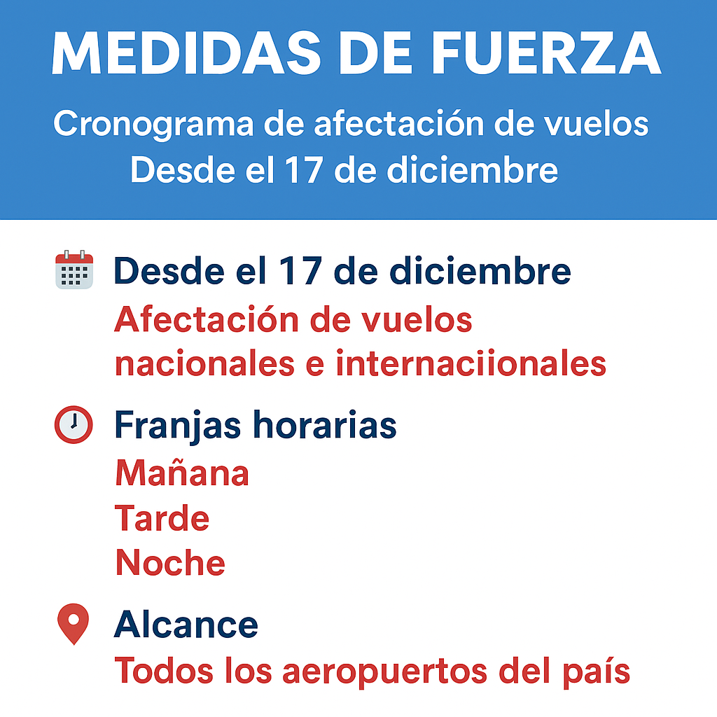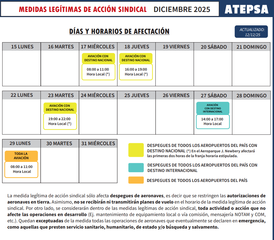 La Asociación Técnicos y Empleados de Protección y Seguridad a la Aeronavegación –ATEPSA– confirmó la continuidad de las medidas legítimas de acción sindical a partir del 17 de diciembre, en el marco del conflicto que mantiene con la Empresa Argentina de Navegación Aérea (EANA), ante la falta de respuestas salariales, operativas y laborales. Las acciones impactarán directamente sobre vuelos nacionales e internacionales en todos los aeropuertos del país.