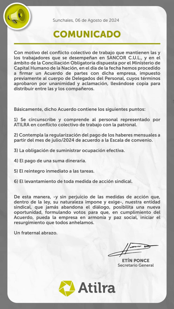 Después de más de siete años de conflicto, Atilra y la empresa SanCor lograron un acuerdo que fue ratificado este mediodía en las oficinas de la Secretaría de Trabajo del Ministerio de Capital Humano.La firma del acta, que pone fin a los prolongados conflictos entre gremio y la firma lactea, fue estampada por Héctor Ponce, secretario general del sindicato, y Marcelo Gornatti, gerente general de SanCor, y en presencia de Julio Cordero, secretario de Trabajo.