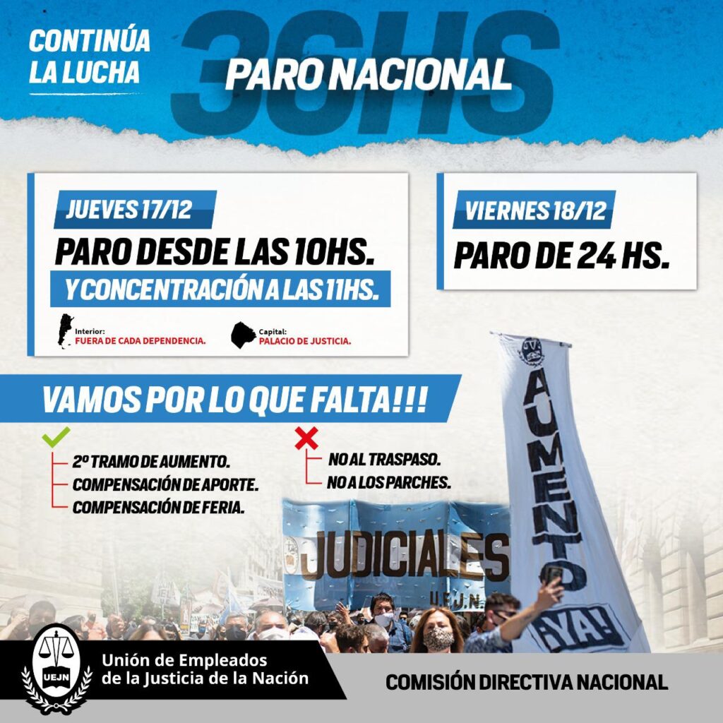 Otro de los reclamos que tiene el gremio que conduce el Secretario de Derechos Humanos de la CGT se relaciona con las compensaciones de aportes de cada uno de los empleados que desarrolla tareas en el PJ a lo largo de todo el país. También, reclaman compensación por feria.