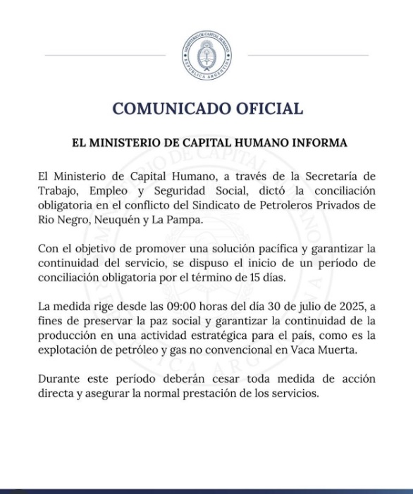 El Sindicato de Petróleo y Gas Privado de Río Negro, Neuquén y La Pampa comunicó que acatará la conciliación obligatoria dictada por la Secretaría de Trabajo de la Nación, en el marco del conflicto que mantiene con las empresas del sector.La medida implica la suspensión de toda acción directa mientras se desarrolla el proceso conciliatorio.