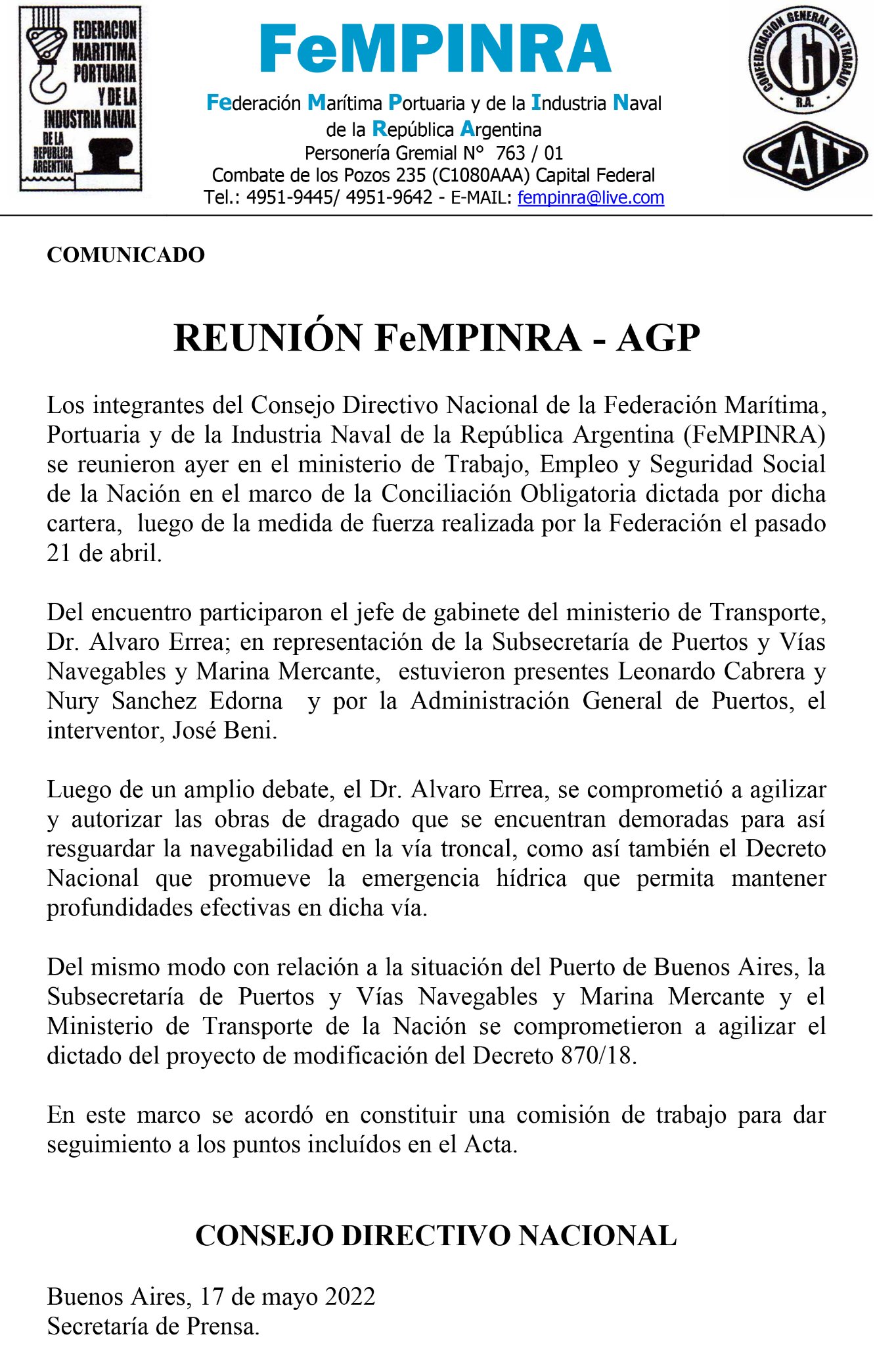 Dentro del marco de la conciliación obligatoria, otorgada tras el paro realizado el 21 de abril, la Federación Marítima, Portuaria y de la Industria Naval de la República Argentina (FeMPINRA), se reunió con la Administración General de Puertos (AGP) y el Ministerio de Transporte, en la sede de la cartera de Trabajo.