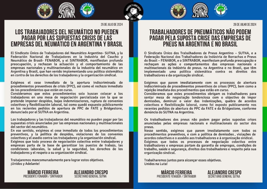 El Sindicato del Neumático –SUTNA– y la Federación de Trabajadores del Brasil (FENABOR), y también el gremio carioca, expresaron este domingo una dura postura hacia las prácticas de las empresas del sector en ambos países. Los sindicatos denuncian una política sistemática en contra de los derechos laborales y la organización sindical, en medio de la apertura indiscriminada de procedimientos preventivos de crisis (PPC) por parte de las compañías.