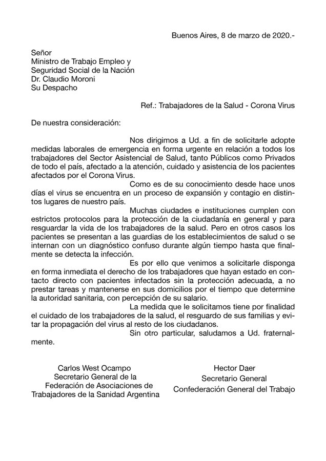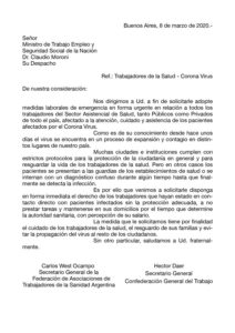 El gremio de la Sanidad le entregó una carta al ministro de trabajo, Carlos Moroni, pidiendole que se ponga a resguardo a todos los trabajadores de la salud y en especial a aquellos que hayan tenido contacto directo con las personas infectadas con el virus del Coranavirus.
