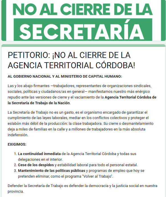 La Asociación de Trabajadores del Estado -filial Córdoba-, junto a la CTA Autónoma, inició una campaña de recolección de firmas para rechazar el intento del Gobierno de cerrar la Agencia Territorial de la Secretaría de Trabajo de la Nación en la provincia. La iniciativa busca visibilizar el conflicto y sumar apoyos de organizaciones sindicales, sociales y ciudadanos en defensa de las políticas laborales.