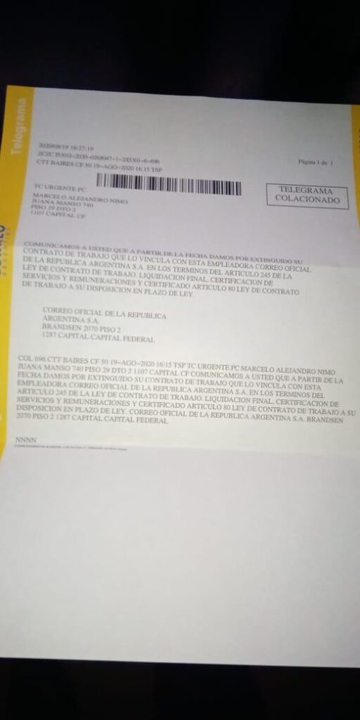 Marcelo Alejandro Nimo, el trabajador despedido por el Correo Argentino denuncio que fue desvinculado de la empresa por realizar informes (la tarea que desempeña) que “conspiran contra la presidenta y el director general”.