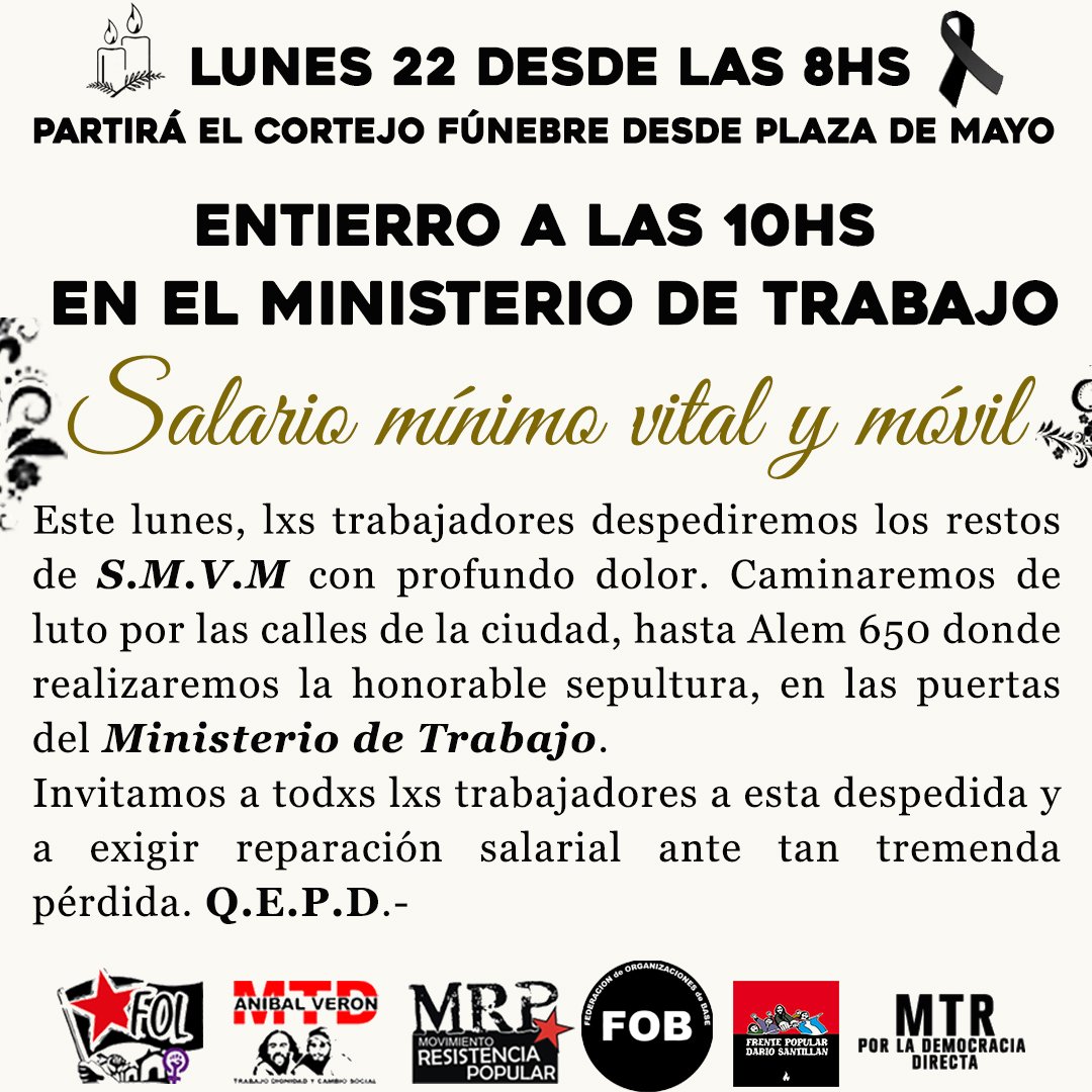 “Las familias de trabajadores humildes de este país damos a conocer, con profundo dolor, el trágico deceso del Salario Mínimo Vital y Móvil. Su despedida será acompañada por Pobreza e Indigencia, que confirmaron participación al conocerse la defunción, y por quienes los acompañamos a través de las devaluaciones, tarifazos, recortes y endeudamientos usurarios”, anunciaron a modo ironico desde el FOL (Frente de Organizaciones en Lucha).