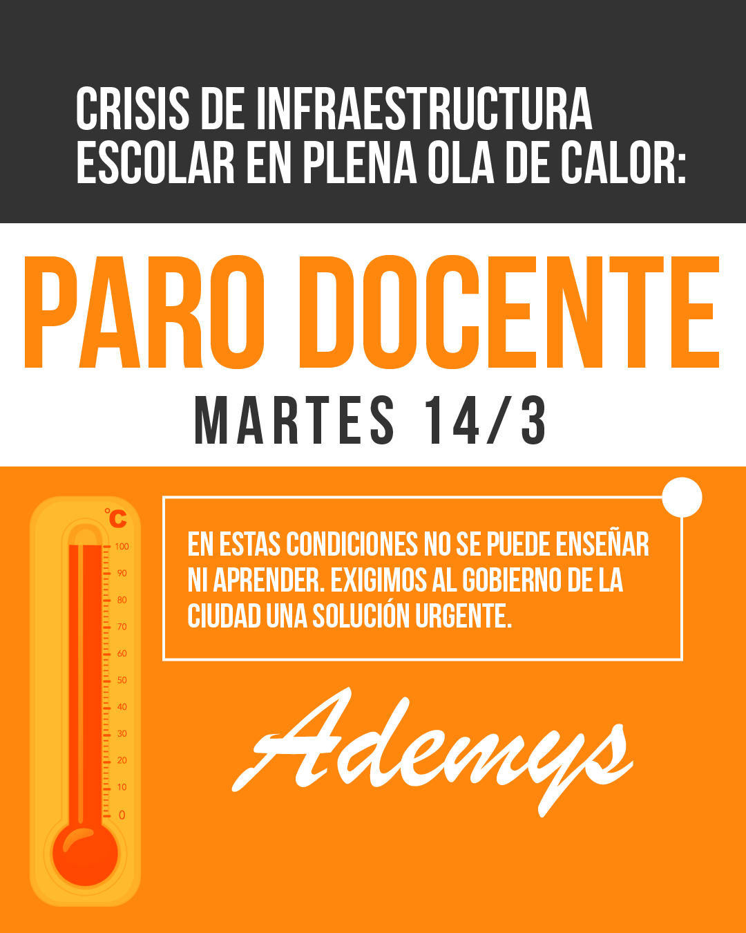 ADEMYS está de paro con lo cual este martes 14 de marzo no habrá clases en Ciudad y además, el gremio realizará una asamblea en la Escuela Julio Cortázar, de la calle Bogotá al 2759.