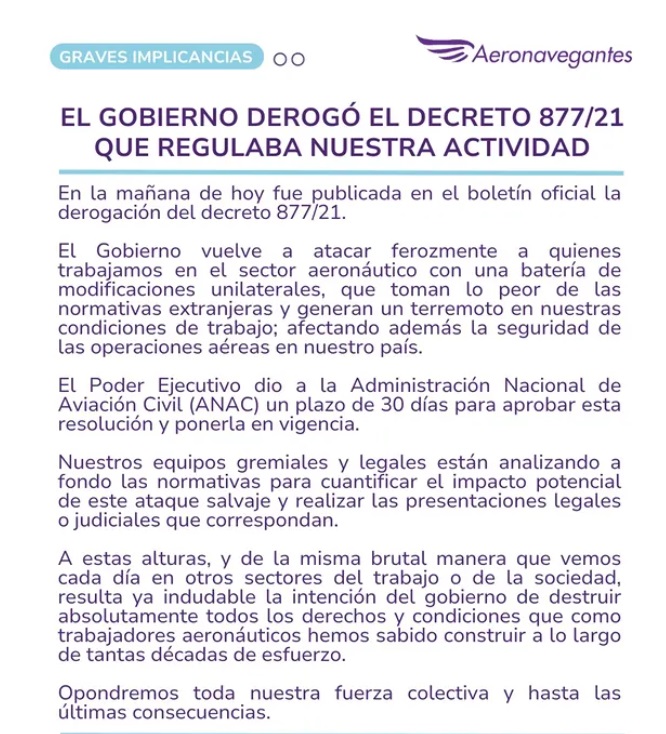 El Decreto 877/21 había sido implementado con el fin de ordenar y dar previsibilidad al marco normativo del trabajo aeronáutico. Su derogación se da en el marco de un proceso de desregulación impulsado por el Gobierno, que ya ha generado conflictos con otros sectores estratégicos y sensibles del país.