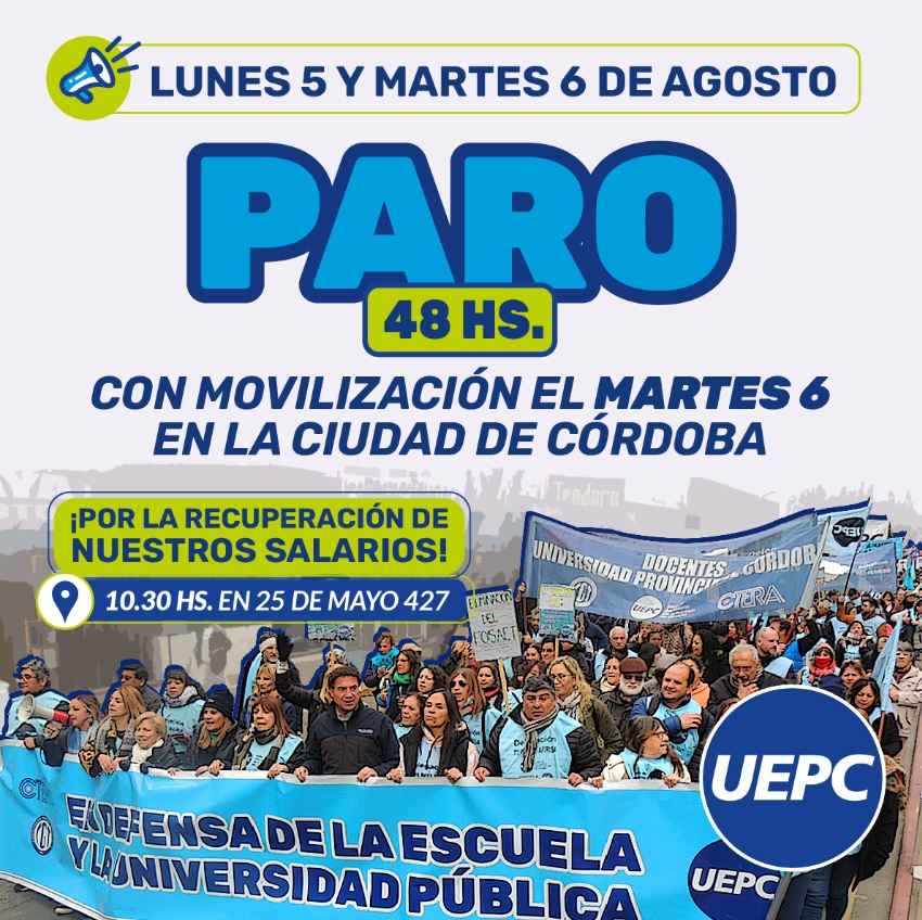La Unión de Educadores de la Provincia de Córdoba, ratificó el paro de 48 hs para este lunes 5 y martes 6 de agosto, con movilización el día martes en la ciudad de Córdoba resuelto por la Asamblea Provincial en su última sesión.