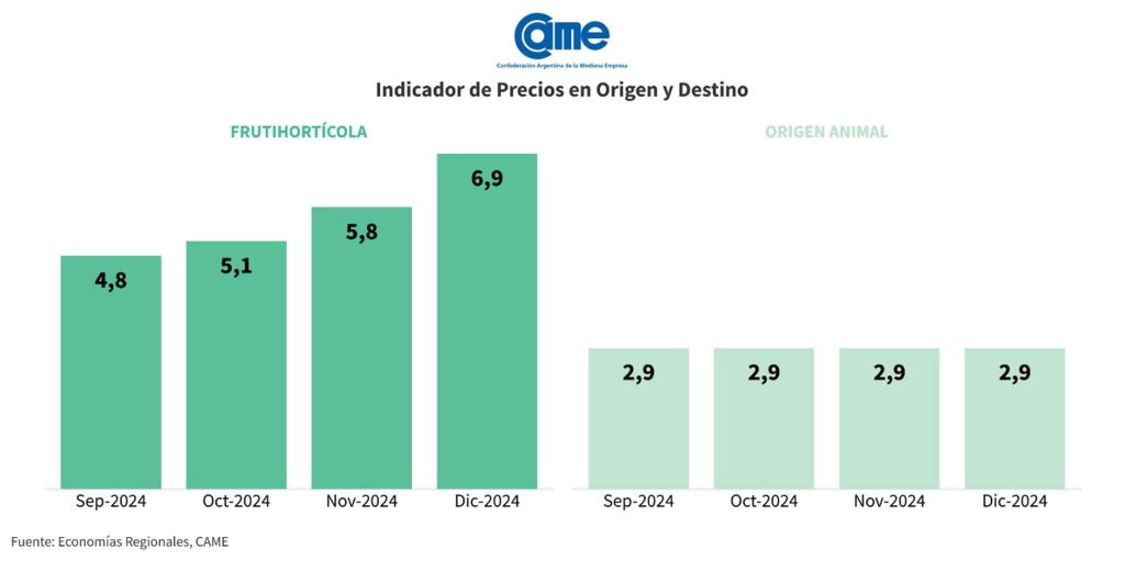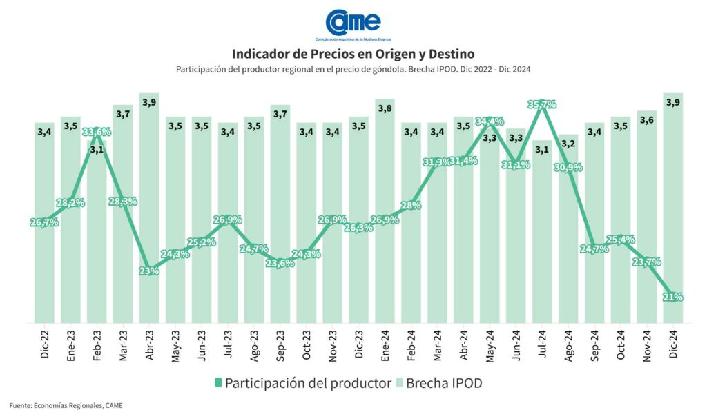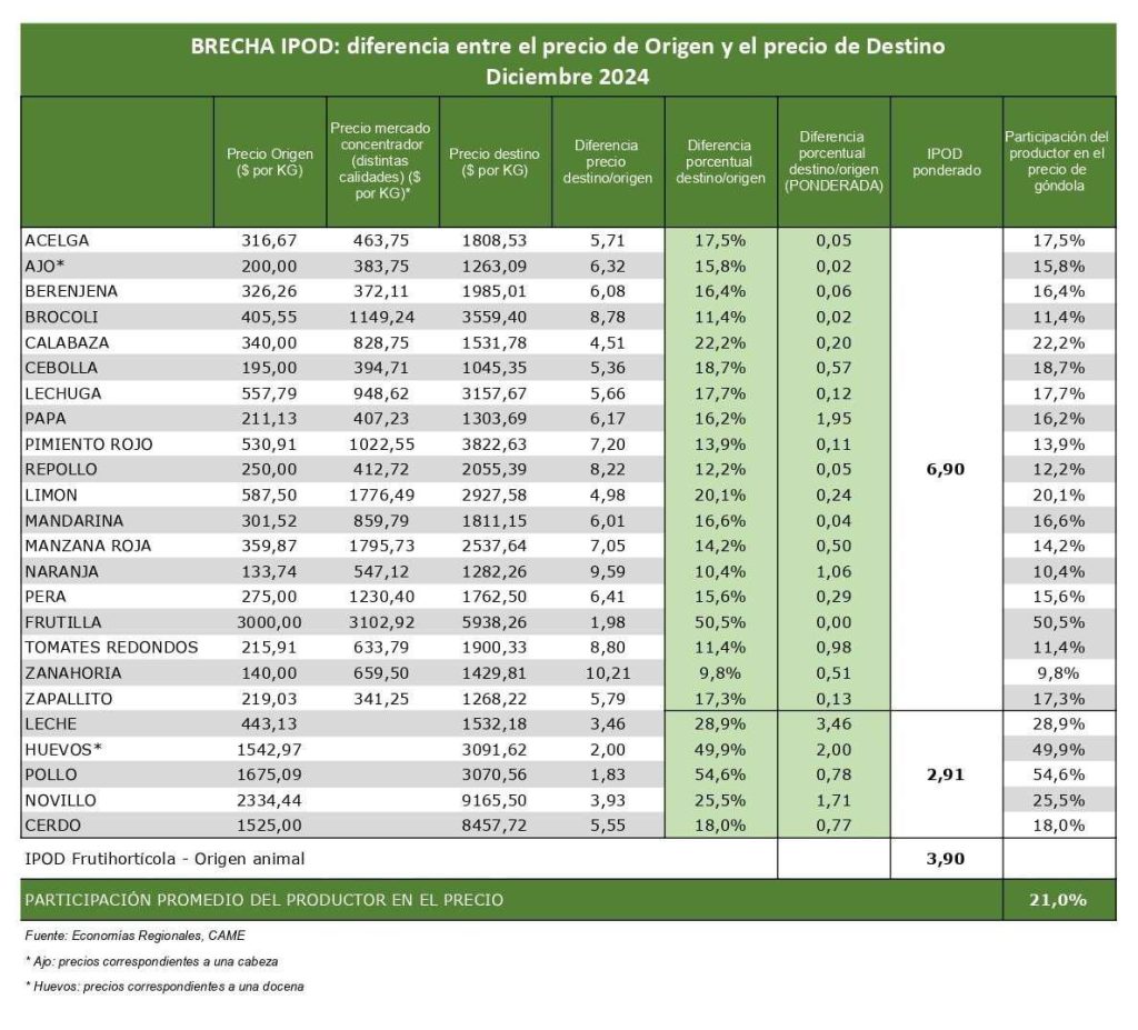 En diciembre de 2024, los precios de los agroalimentos se multiplicaron por 3,9 desde el productor hasta el consumidor, según el informe del Indicador de Precios en Origen y Destino (IPOD) elaborado por la Confederación Argentina de la Mediana Empresa –CAME-. Este dato letal revela un escenario mas que complejo donde trabajadores rurales, productores y consumidores enfrentan desafíos importantes derivados de las distorsiones en la cadena de comercialización.