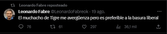 Este escenario no es de los más apetecibles para Fabre, quien posteó el 19 de agosto, minutos antes de las 4 de la tarde: “El muchacho de Tigre me avergüenza pero es preferible a la basura liberal”. Algunos de los alcanzados por este posteo, quisieron participar de la catarsis del famoso dirigente tanguero.