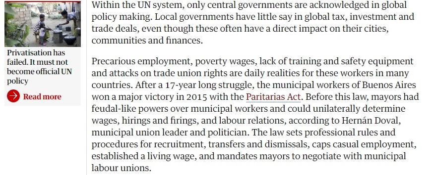 “Después de una larga lucha de 17 años, los trabajadores municipales de Buenos Aires, obtuvieron una gran victoria en 2015 con la Ley de Paritarias”, subrayó la también secretaria general del Consejo Mundial de Sindicatos Globales. “Antes de esta ley, los alcaldes tenían poderes feudales sobre los trabajadores municipales”, criticó la italiana en su artículo. “Podían determinar unilateralmente los salarios, las contrataciones y los despidos, y las relaciones laborales”, sigue.