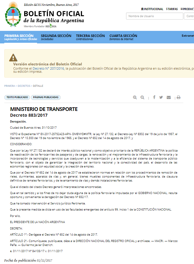 El Ministerio de Transporte, a través del decreto 883/17, derogó el publicado el 15 de agosto de 2017, en el cual le otorgaba las facultades al ministro Guillermo Dietrich, para clausurar ramales ferroviarios y levantar vías de forma definitiva. Los gremios del sector anunciaron el levantamiento del estado de Alerta y Sesión.