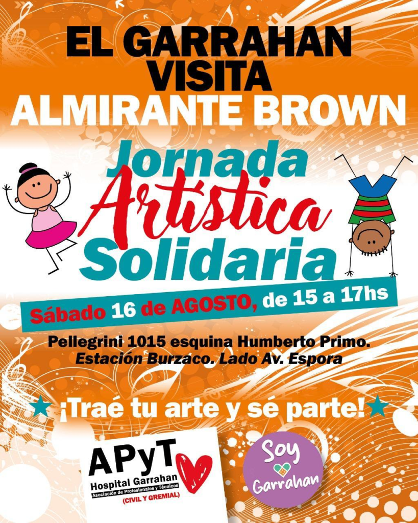 El Hospital Garrahan visitará Almirante Brown el próximo sábado 16 de agosto para llevar adelante una Jornada Artística Solidaria en la que convocan a vecinos y vecinas a sumarse con su arte. La actividad se desarrollará entre las 15 y las 17 horas en la Estación Burzaco con entrada libre y gratuita.