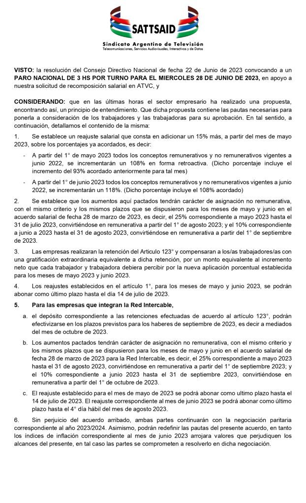Finalmente, tras varias audiencias truncadas y paro de actividades producto de una postura negativa por parte de la patronal a negociar salarios acorde a las demandas de los trabajadores y de la situación del país, el Sindicato Argentino de Televisión, Telecomunicaciones, Servicios Audiovisuales, Interactivos y de Datos logró llegar a un entendimiento con la cámara empresaria luego de que las mismas acercaran una nueva propuesta.