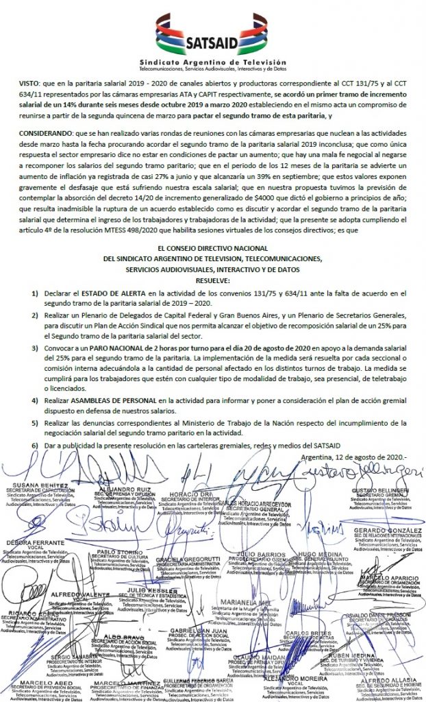 Declaró el estado de alerta y convoca a paro nacional de 2 horas por turno para el día 20 de agosto de 2020 en apoyo a la demanda salarial del 25%