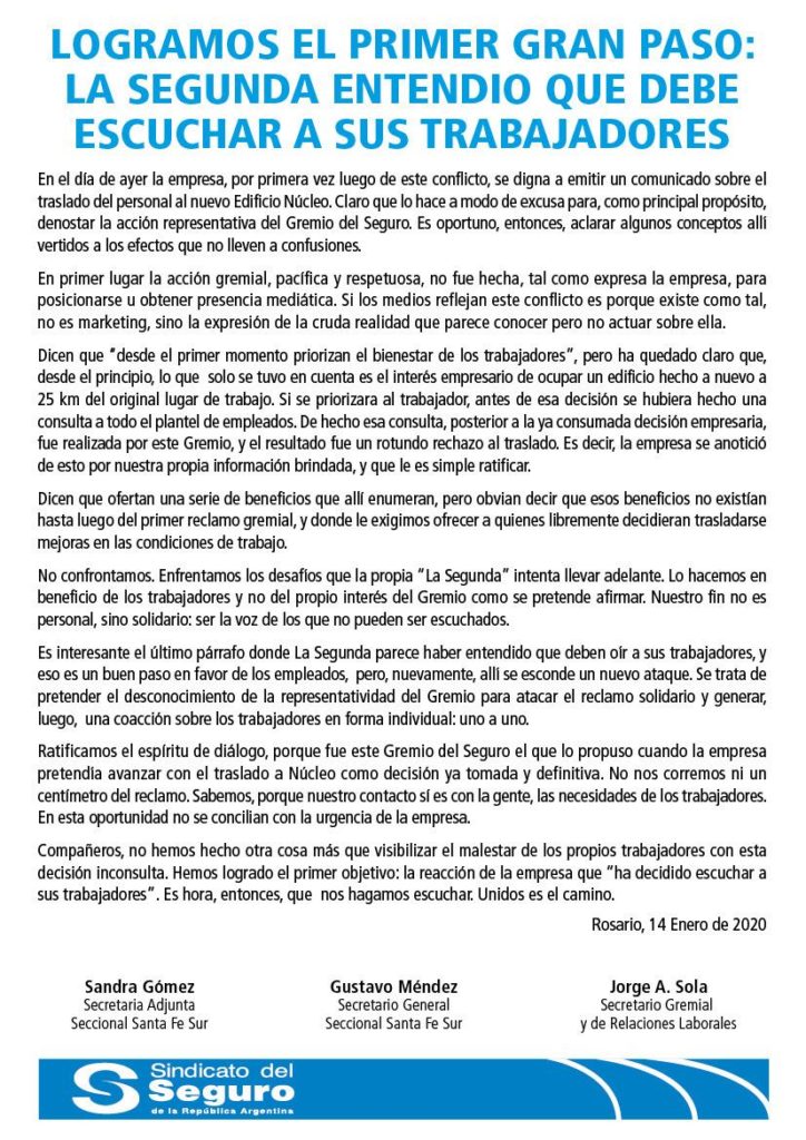 Luego de la pacífica movilización que realizo el Sindicato de Trabajadores del Seguro a la empresa “La Segunda” en la ciudad de Rosario con el objetivo de que la empresa se haga responsable de los perjuicios que le ocasionará a los 400 trabajadores de la misma al trasladar a sus oficinas a 40 kilómetros de su lugar.
