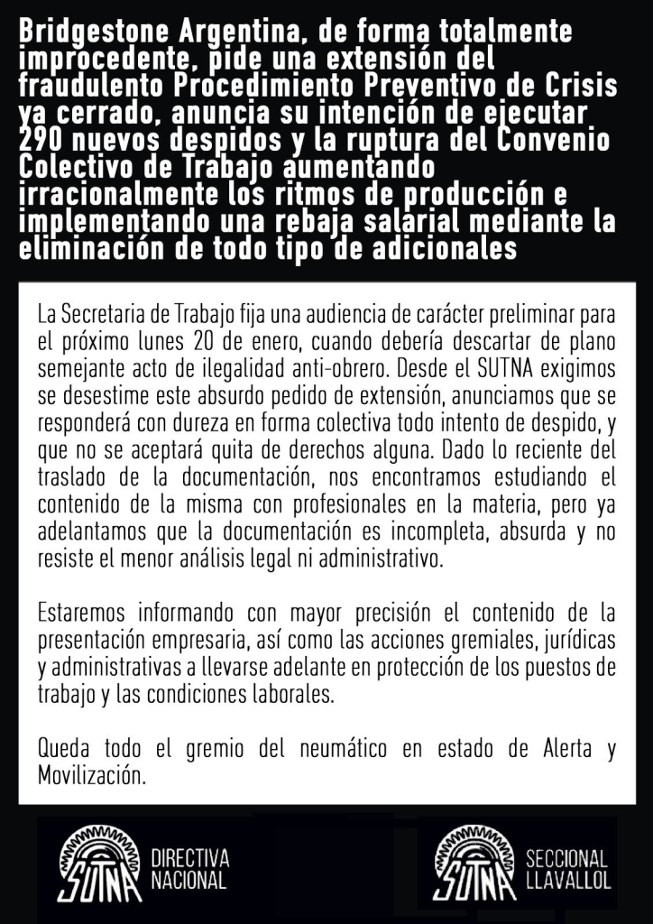 El Sindicato Único de Trabajadores del Neumático –SUTNA- emitió un comunicado este martes en el que acusa a la directiva de Bridgestone Argentina de solicitar “de forma totalmente improcedente” la extensión de un Procedimiento Preventivo de Crisis (PPC) que, según el gremio que conduce Alejandro Crespo, ya estaba cerrado.