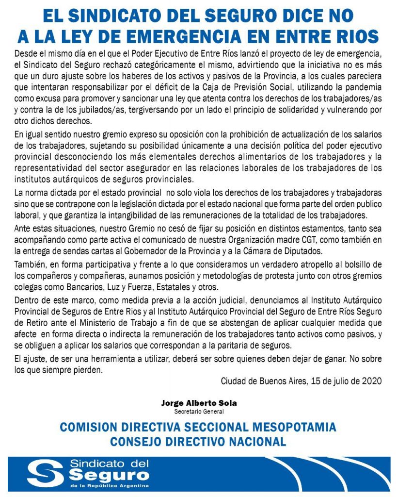 La Ley aprobada en el parlamento de la provincia de Entre Ríos no cesa en la reprobación por todo el arco sindical, con consecuencias de protesta y repudio por parte de todas las centrales obreras. El Seguro en esta oportunidad, sumó esta vez una denuncia ante el Ministerio de Trabajo contra el Instituto Autártico Provincial de Seguros local, asimismo como al Instituto Autártico Provincial del Seguro de Entre Ríos Seguro de Retiro.