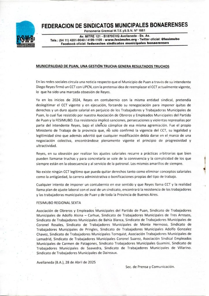 Según denunció la Federación de Sindicatos Municipales Bonaerenses –FeSiMuBo-, organización que lidera Rubén Cholo García, el intendente intenta desconocer el CCT vigente, que fue homologado hace menos de dos años conforme a la Ley 14.656. En su lugar, pretende imponer un nuevo acuerdo firmado con organizaciones minoritarias, a pesar de que el sindicato mayoritario de Puan, nucleado en FeSiMuBo, representa a más del 70% de los afiliados municipales.