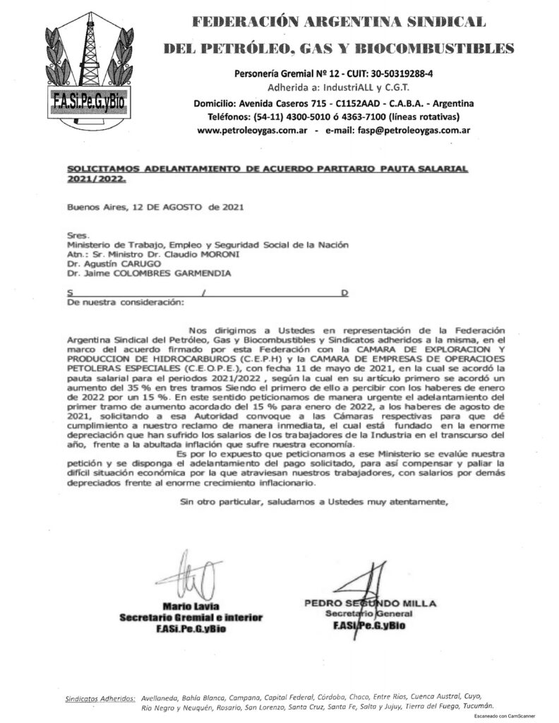 En el marco de un contexto de altos niveles de inflación que atraviesa la economía argentina y frente al deterioro constante del poder adquisitivo de salario, desde la Federación Argentina Sindical del Petróleo, Gas y Biocombustibles (FASIPeGyBio) peticionó ante el ministerio de Trabajo y las cámaras CEPH y CEOPE el urgente adelantamiento del primer tramo de aumento del 15% acordado para enero de 2022 a los haberes de agosto de 2021, solicitando a la autoridad competente convoque a las cámaras respectivas para que dé complimiento de manera inmediata a nuestro reclamo.