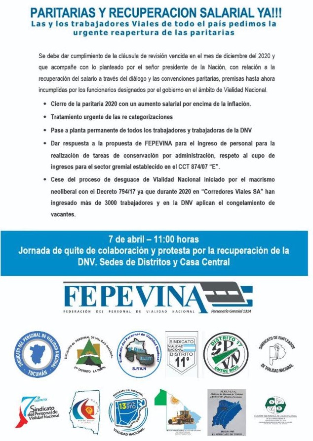 Desde la Federación del Personal de Vialidad Nacional (FEPEVINA) anunciaron una Jornada de quite de Colaboración y protesta por la recuperación de Vialidad Nacional.