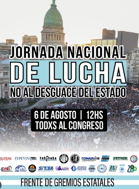 “Este miércoles 6 de agosto, todas y todos al Congreso: en defensa del Estado, de lo público y de los derechos del pueblo argentino”.