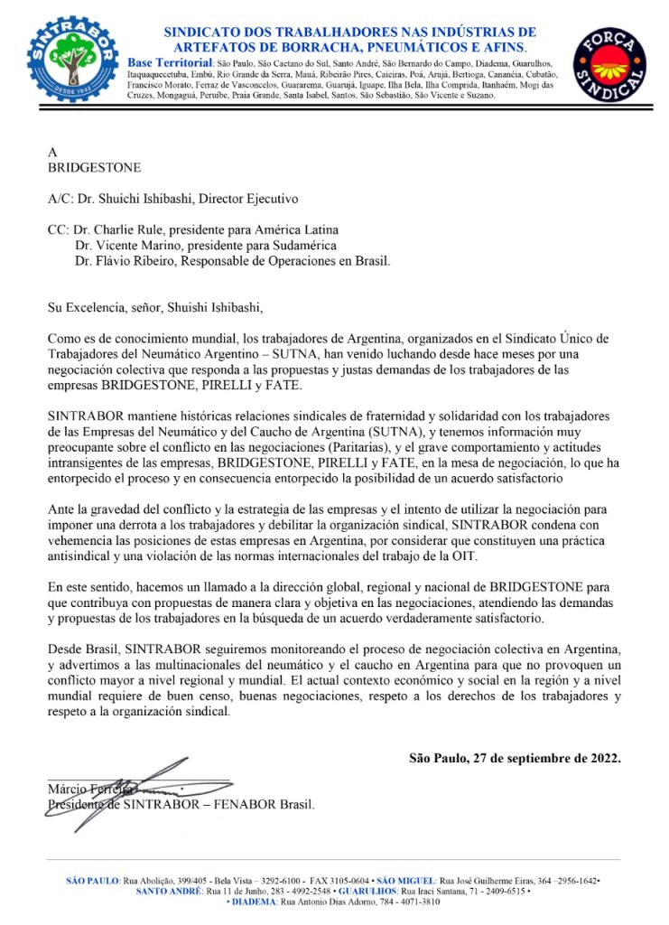 “Hacemos un llamado a la dirección global, regional y nacional de BRIDGESTONE para que contribuya con propuestas de manera clara y objetiva en las negociaciones, atendiendo las demandas y propuestas de los trabajadores en la búsqueda de un acuerdo verdaderamente satisfactorio”, esto figura en una carta dirigida desde el Sintrabor brasilero, a las autoridades de Bridgstone, encabezada por Shuishi Ishibashi.