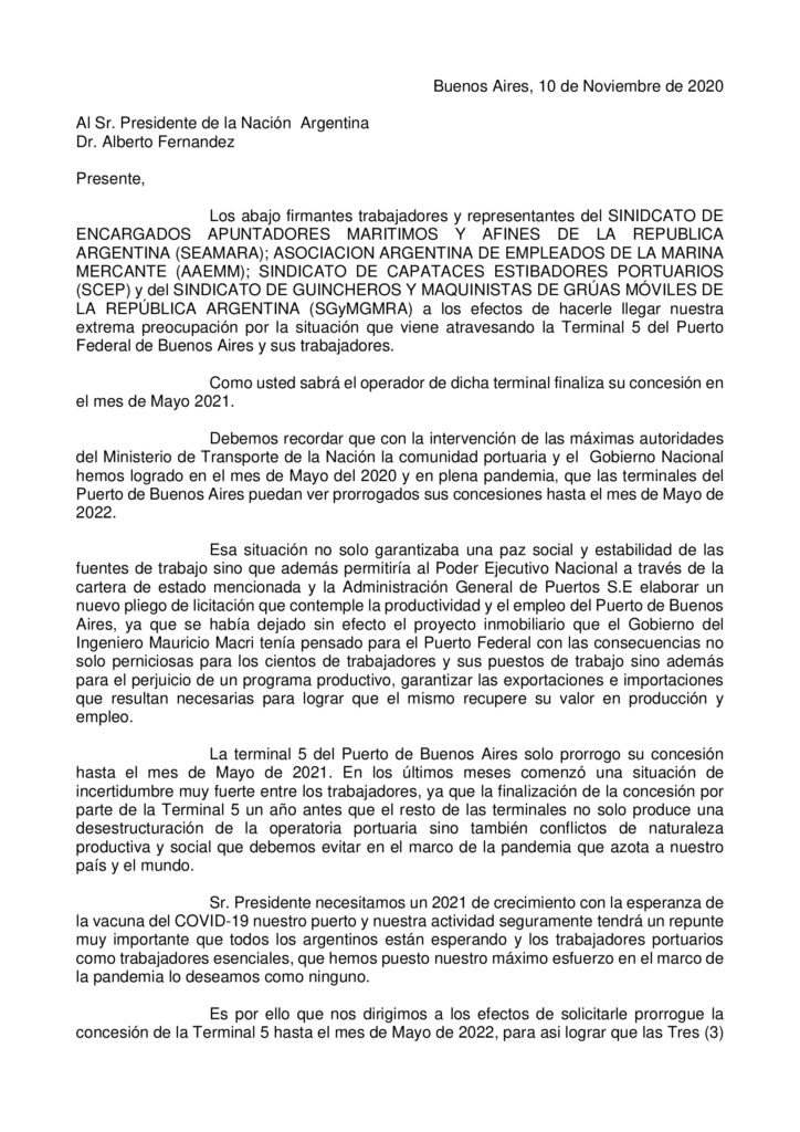Los sindicatos del sector, adheridos a la Fempinra, le enviaron una carta al presidente de la nación, Alberto Fernández, con el objetivo de que el Jefe de Estado considere extender la concesión del muelle en cuestión hasta mayo de 2022, así como sí serán las concesiones de la Terminal 4 y la terminal Río de La Plata.