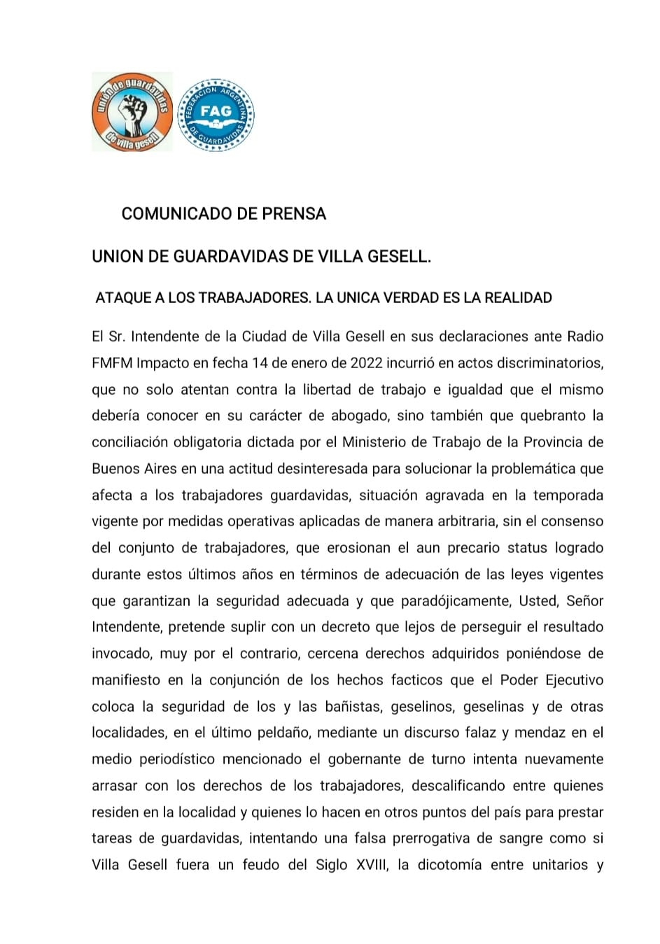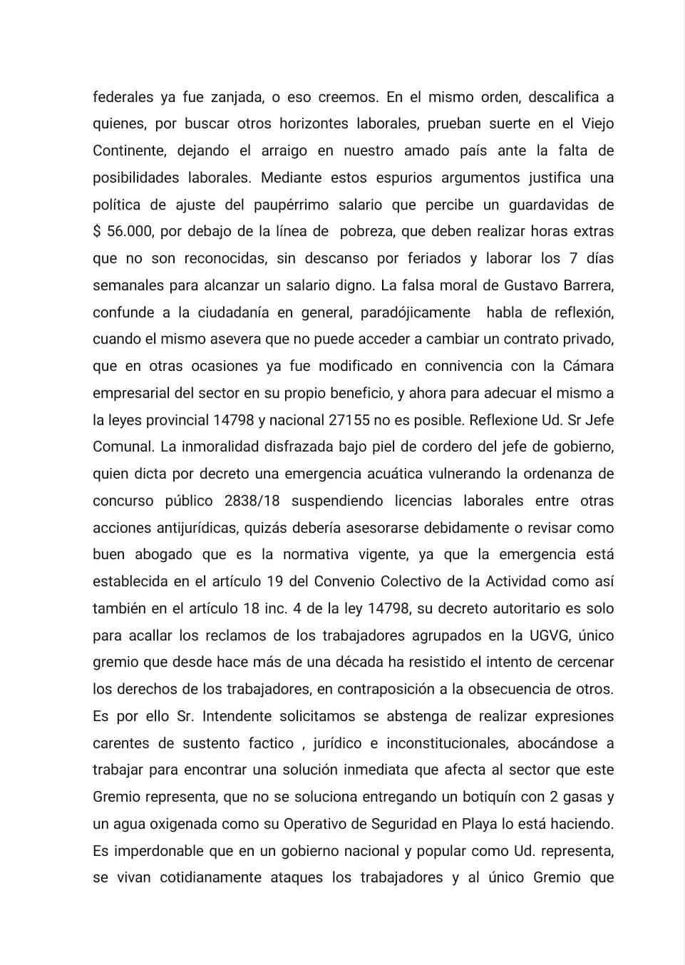 🔵La UGVG sacó una solicitada durísima contra las declaraciones del intendente Barrera, en el que le apunta a los guardavidas por, entre otras cosas, emigrar a buscar trabajo en Europa🔴