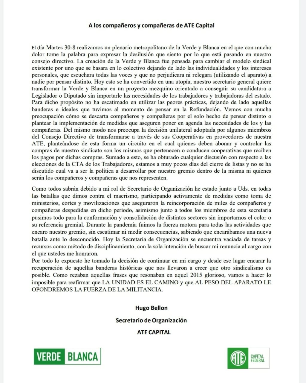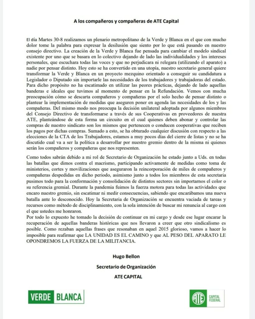 Día de caza en ATE Capital. El documento que redactó Hugo Bellón, secretario de Organización de ATE Capital es realmente incisivo y determinante.