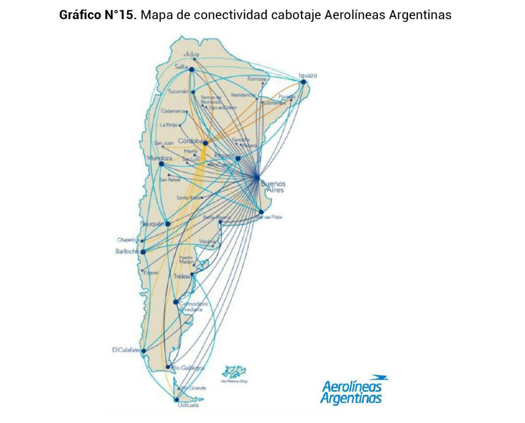 El CEPA incluye en su estudio que AA no recibió transferencias del Tesoro en 2023 y posee un superávit comercial de USD 32 millones. “Entre 2019 y 2023, registró un crecimiento del 34% en los ingresos por ventas de pasajes y cargas medidos en dólares”, sostiene y agrega: “Alcanzó un récord de pasajeros transportados en 2023 y conecta 42 rutas federales siendo la única aerolínea que llega a 21 destinos de cabotaje”.