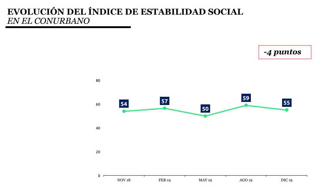 Con la victoria de Alberto Fernández el 27 de octubre y su asunción al frente de la Jefatura de Estado mañana por la mañana y por cuatro años, y según lo concluido por el Índice de Estabilidad Social, “las expectativas económicas mejoran levemente”. “Sin embargo, predomina el sentimiento negativo ya que 54% considera que la economía estará mal o muy mal y 42% considera que estará bien o muy bien”, concluye.