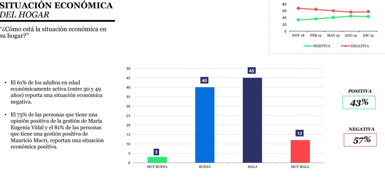 La evaluación también hace un repaso por los votantes del Gobierno saliente y sostiene que de las personas que eligieron a Macri como opción, “8 de cada 10 reporta una situación económica positiva y un porcentaje similar dice estar satisfecho con su vida personal. Un tercio de sus votantes puede, incluso, ahorrar parte de sus ingresos. A pesar de eso, más de la mitad (62%) teme perder el empleo”. A diferencia de esto último, el 73% de los votantes del Frente de Todos (triunfadora en las últimas elecciones) dicha fuerza reporta una situación económica negativa, más de la mitad no llega a fin de mes y sólo el 5% puede ahorrar una parte de sus ingresos”.