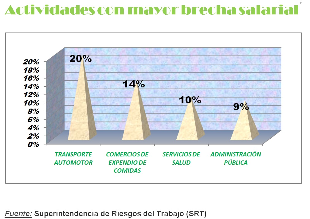 “Las actividades con mayores brechas salariales son las relacionadas con los servicios de transporte automotor 20%; comercios de expendio de comidas 14%; los servicios de salud 10% y en puestos de la administración pública 9%”, arroja, según datos de la Superintendencia de Riesgos del Trabajo.