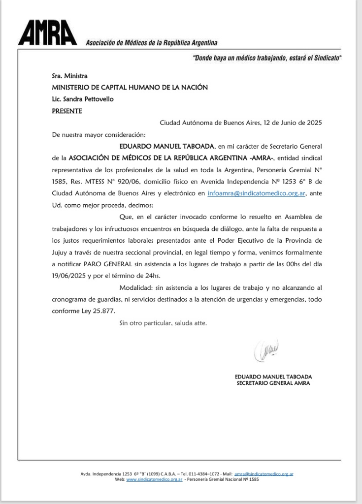 Los conflictos en el área de la Salud por estos meses han abarcado al Hospital Garrahan casi en su totalidad y al intento de cierre del Hospital Naval por parte del Gobierno Nacional, aunque en el resto del país suceden hechos que también forman parte de un escenario de crisis. En Jujuy, los y las médicos agremiados en el gremio AMRA definieron comenzar medidas de fuerza este 30 y 31 de julio a raíz de la permanente dilación por parte del Ministerio de Trabajo para convocar a las negociaciones salariales.