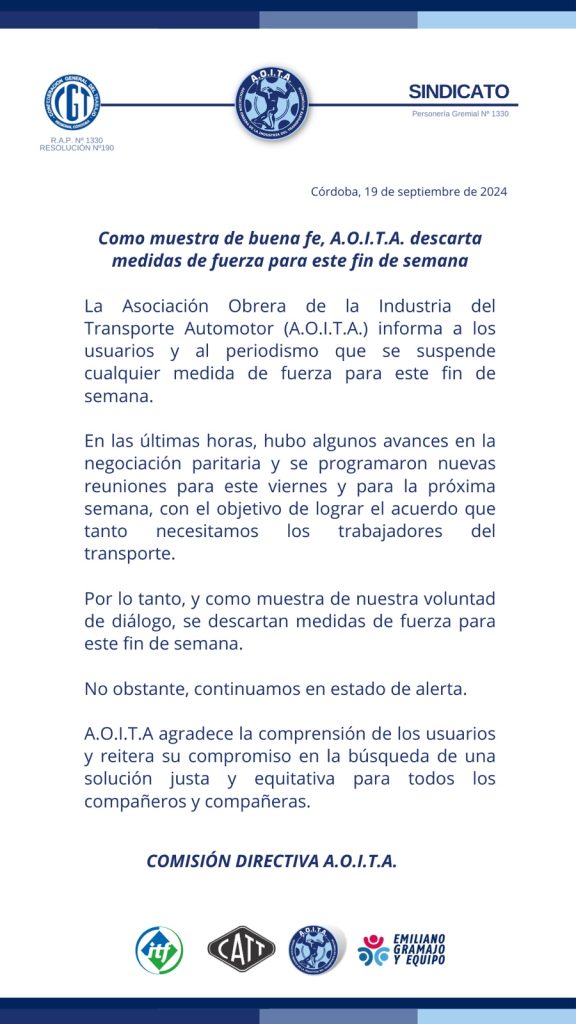 A pesar de esta tregua temporal, el sindicato aclaró que los trabajadores seguirán “en estado de alerta” hasta que se concrete un acuerdo definitivo. La organización gremial expresó su gratitud a los usuarios del transporte por su paciencia y comprensión en este contexto de conflicto. “A.O.I.T.A. agradece la comprensión de los usuarios y reitera su compromiso en la búsqueda de una solución justa y equitativa para todos los compañeros y compañeras”, concluye el comunicado.