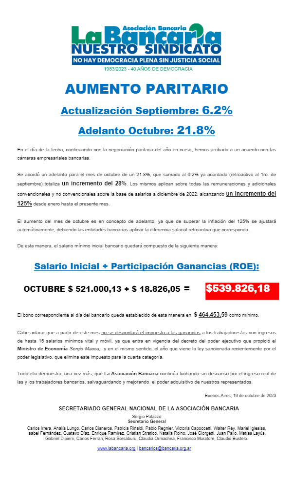 De esta manera, el gremio de los Bancarios selló un adelanto para el mes de octubre de un 21.8%, que sumado al 6.2% ya acordado (retroactivo al 1ro. de septiembre) totaliza un incremento del 28%. Los mismos aplican sobre todas las remuneraciones y adicionales convencionales y no convencionales sobre la base de salarios a diciembre de 2022, alcanzando un incremento del 125% desde enero hasta el presente mes.