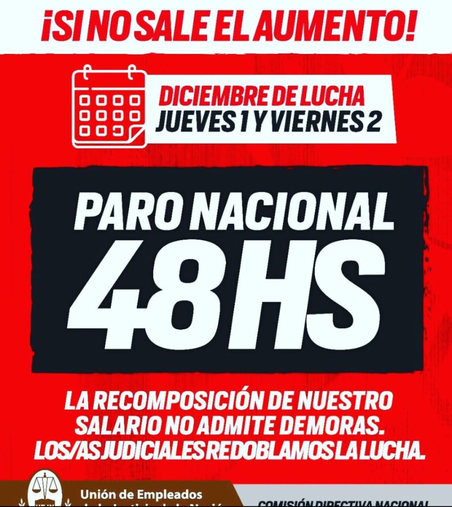 La Unión de Empleados Judiciales –UEJN- lanzó un nuevo paro nacional de 48 horas ante la demora del 4to tramo de la paritaria que culminaría con la paritaria interanual pero que se ha estirado más de lo cotidiano.