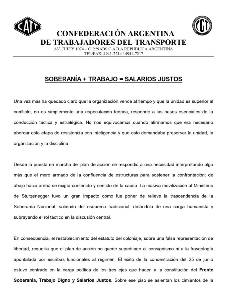 La Confederación Argentina de Trabajadores del Transporte (CATT) difundió un durísimo y contundente comunicado, en el que reafirma su compromiso con la defensa de la soberanía, el trabajo digno y los salarios justos, en un contexto de fuerte cuestionamiento a las políticas del Gobierno nacional. El texto, firmado por su secretario general, Juan Carlos Schmid, y el secretario de prensa, Juan Pablo Brey, denuncia el deterioro social y económico, advierte sobre el avance de la precarización laboral y llama a sostener la unidad y la movilización como ejes centrales de la resistencia sindical.
