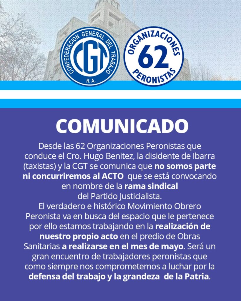 Trascendió que la rama oficial de las “Seis dos”, la de Ibarra y la ni más ni menos, que la Confederación General del Trabajo –CGT- se desmarcá de Baradero. “No somos parte ni concurriremos al acto que se está convocando en nombre de la rama sindical del Partido Justicialista”. Contundente y sin vueltas, el peronismo más alejado del kirchnerismo anunció en redes que en mayo habrá un acto propio en el predio de Obras Sanitarias, en la Ciudad Autónoma de Buenos Aires, en el barrio de Nuñez.