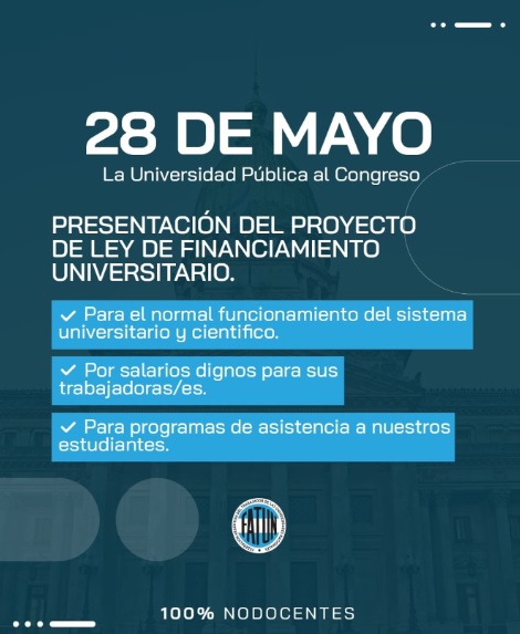 Este miércoles 28 de mayo, la comunidad universitaria y científica de todo el país presentará un proyecto de Ley de Financiamiento Universitario y realizará se concentrará de 10 a 13 horas en la Plaza de los dos Congresos, por una ley que garantice los recursos que permitan resguardar la Universidad y la ciencia nacional.